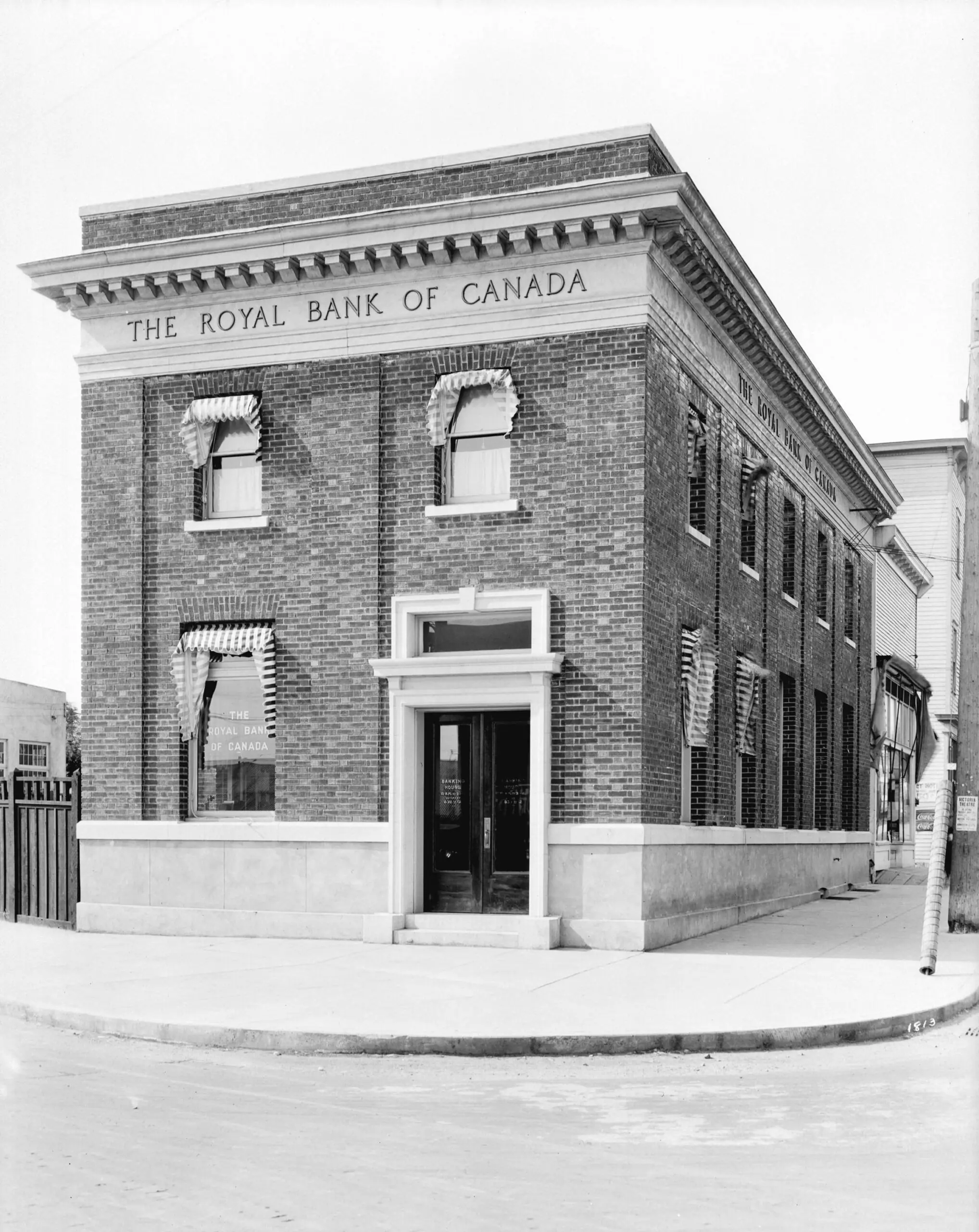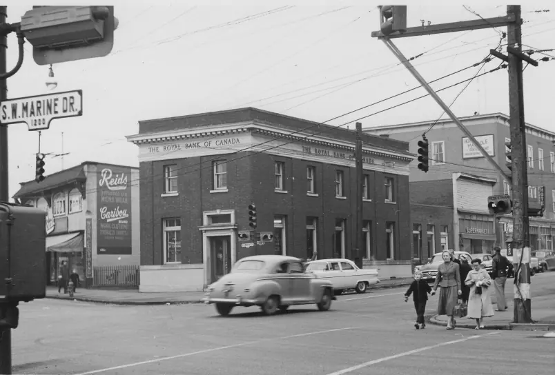 Construction of the Royal Bank of Canada (RBC) Marpole Location at #5 SW Marine Drive. By this time, Royal Bank had branches in 801 Canadian communities and was Canada’s largest bank. Marpole, in the 1920s, was a neighbourhood of sawmills and canneries. It was also home to the families of managers and office workers, who each day travelled the streetcar line up Oak Street.